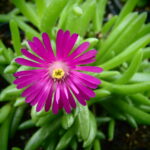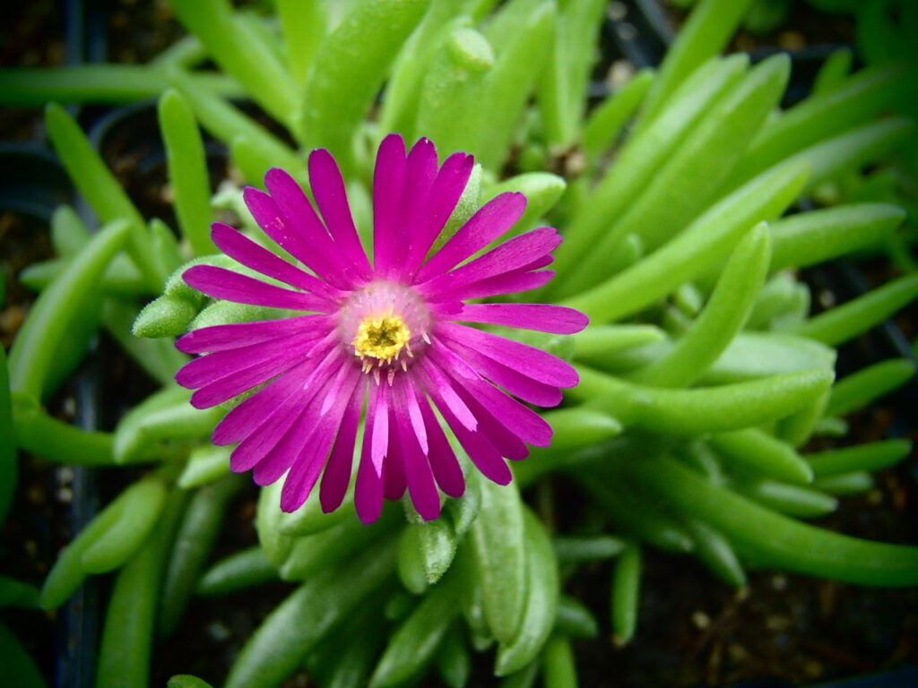 Delosperma Cooperi , 5cm, kontajner 12cm – juhoafrický sukulent na plné slnko, vyžaduje minerálny štrkovitopiesčitý, dobre priepustný substrát, kvitne nepretržite od polovice leta do mrazov. Je vysoká 5-10 cm.
