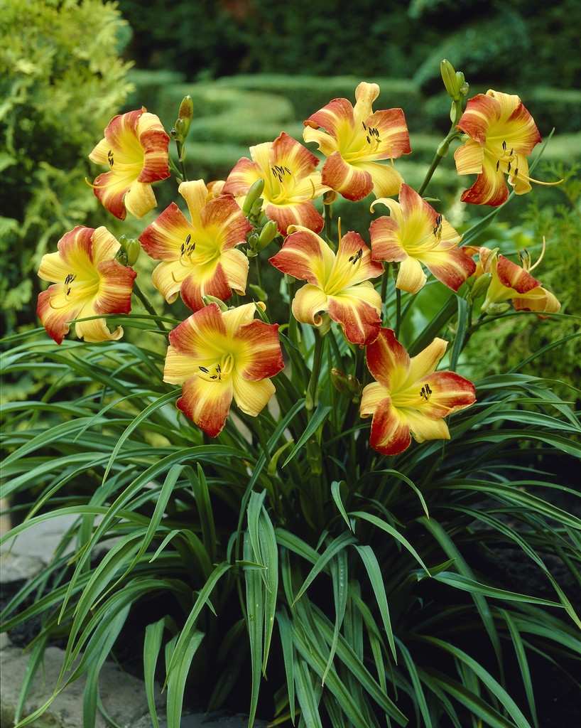 Nádherný mix dvoch farieb kultivaru Frans Hals s dvojfarebnými kvetmi kde sa pravidelne mieša zlatožltá farba s tmavšími tmavočervenooranžovými časťami.Vytvárajú kompaktné trsy dlhších zelených tenkých listov so vzprimenou stonkou na ktorej zakvitajú hviezdicovité až trubkovité väčšie kvety.