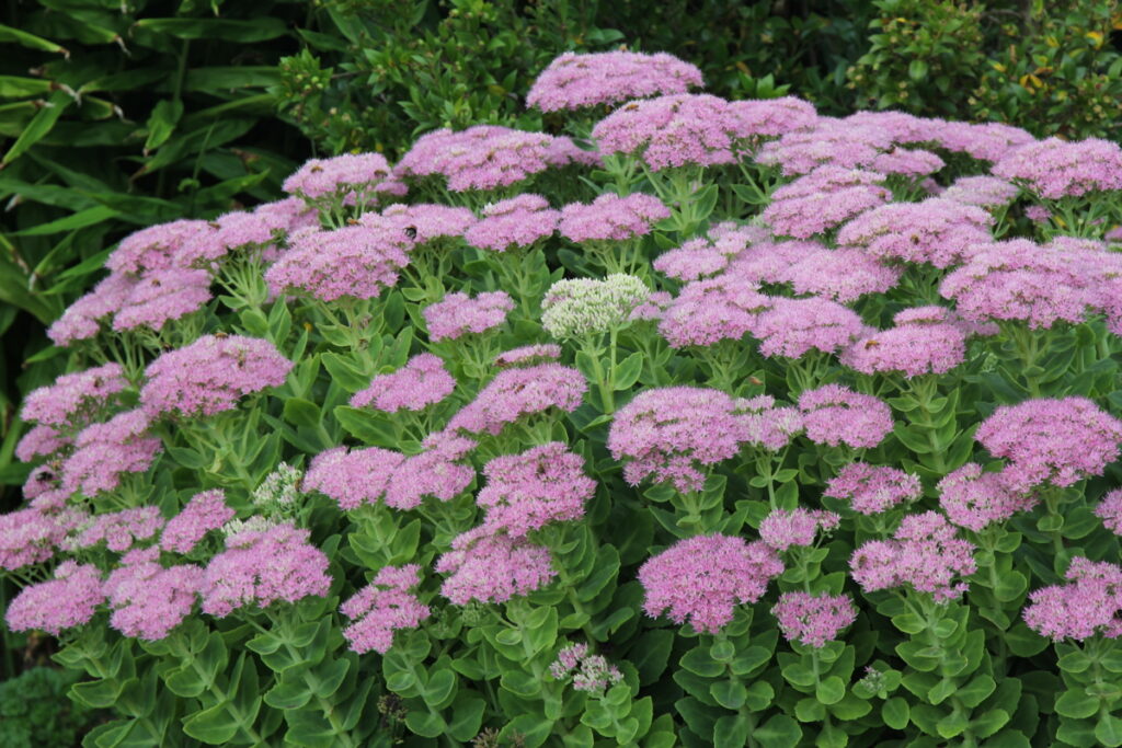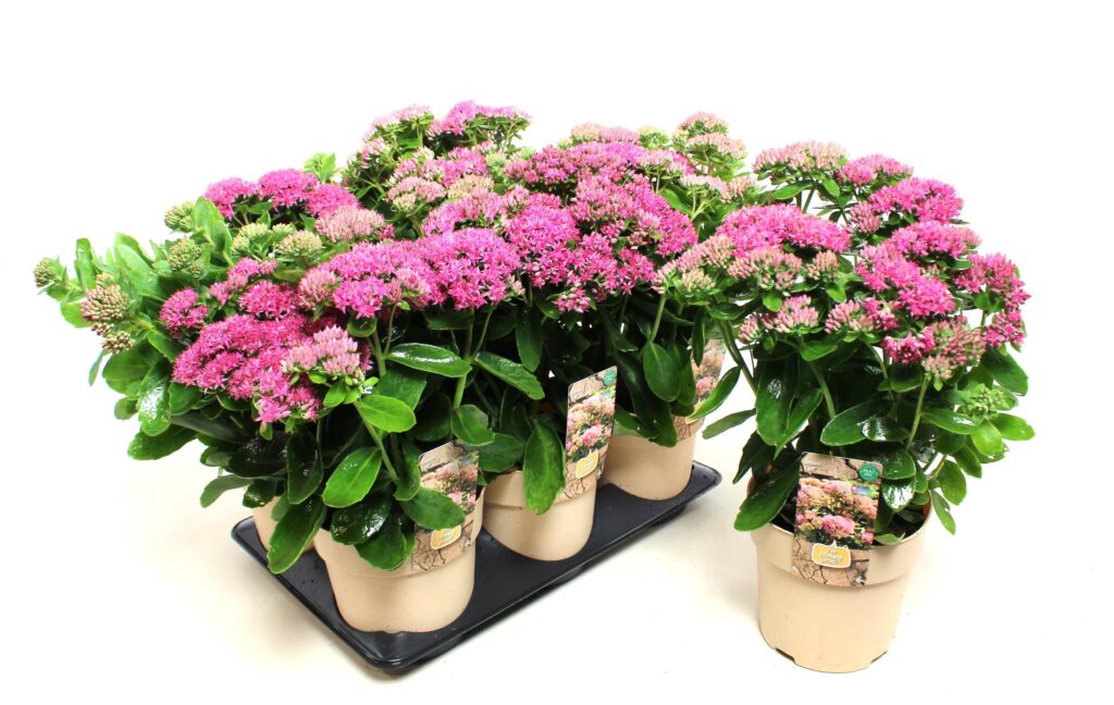 Kultivar rozchodníka nádherného so sýto ružovými kvetmi, ktoré sú spestrením jesenných záhonov na plnom slnku.